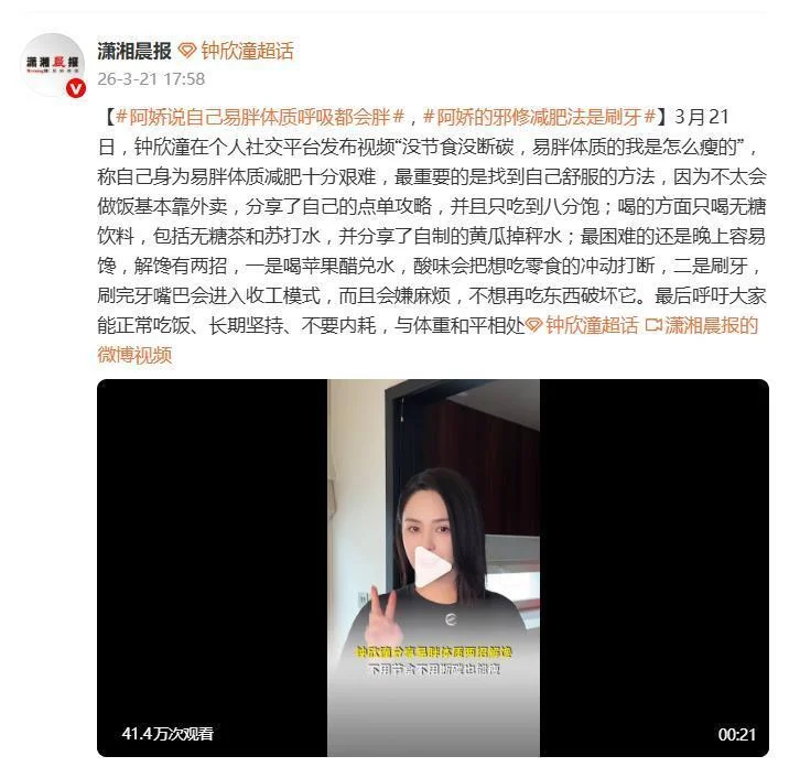 3月21日,阿娇钟欣潼在社交平台发布的一条减肥分享视频,瞬间戳中了无数“易胖体质”网友的心巴。视频标题“没节食没断碳,易胖体质的我是怎么瘦的”堪称精准吸睛,而她自嘲“呼吸都胖”的坦诚,更是拉满了同病相怜者的好感度。