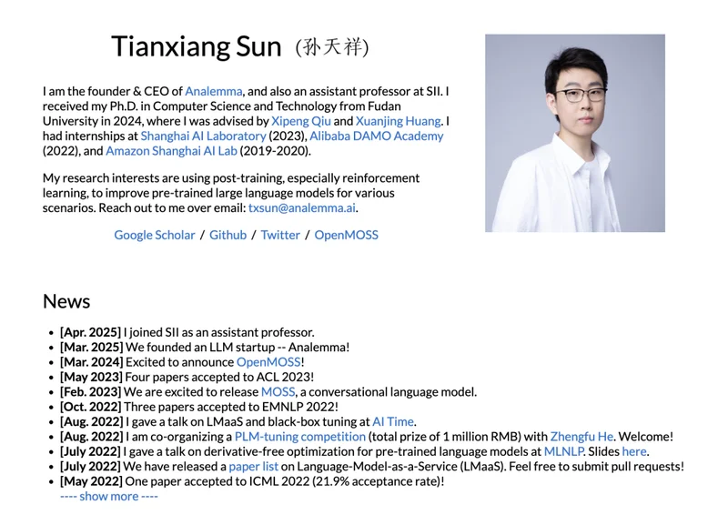 2024年博士毕业后,他辗转进入上海创智学院担任助理教授,同时创立了Analemma。公司的slogan是:“In a world of infinite questions, it is time to build an infinite mind”,翻译过来就是:在一个问题无穷的世界,是时候构建一个无穷的心智。