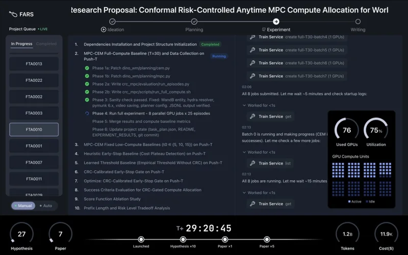 打开FARS的直播页面,你能看到的东西相当丰富。顶上是当前课题的标题,下面一条进度条标着“选题→规划→实验→写作”走到了哪一步。左边是项目队列,十几个编号排着队,跑完一个换下一个。中间是当前项目的实验清单,哪步做完了、哪步还在跑,标得清清楚楚。右边是GPU集群的实时状态。如截图里显示的是76块GPU同时在干活,利用率75%。最底下一排数字实时跳动:已经产出了多少个假设、多少篇论文、跑了多久、烧了多少钱,整个界面就像一个科研工厂的监控大屏,全程直播放送。