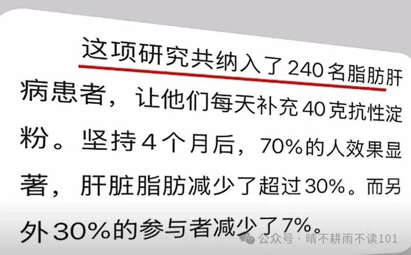 上海六院贾伟平院士团队在《细胞代谢》发表的研究显示,240名脂肪肝患者每日补充40g抗性淀粉,4个月后:70%的人肝脏脂肪减少超过30%,剩余30%的人肝脏脂肪也减少了约7%。除了降低肝脏脂肪,它还能帮助降低总胆固醇、甘油三酯和低密度脂蛋白胆固醇,对心血管健康也有益。