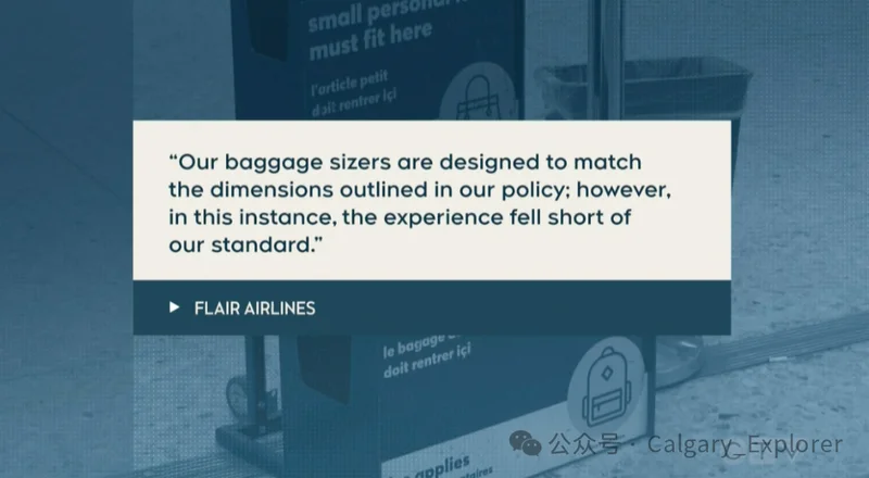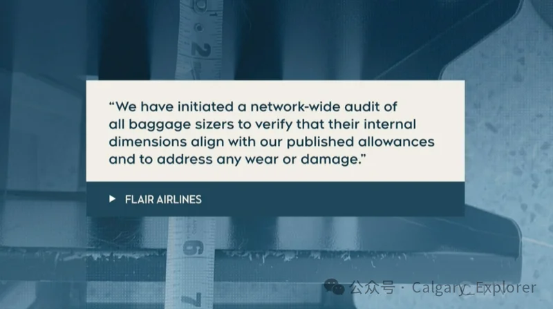 Flair航空发言人在声明中承认,格朗丁的经历“未达我们的标准”,并宣布两项措施:一是启动全网络行李测量架审计,覆盖包括卡尔加里国际机场(Calgary International Airport, YYC)在内的所有枢纽,重点核实测量架内部尺寸是否与官网一致,并处理磨损或损坏问题;二是向格朗丁退还78加元费用。