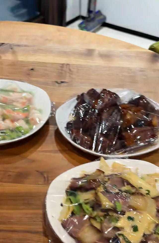 揉好面的梅婷将面团放在一边醒着开始吃饭,之后梅婷婆婆也入镜了,梅婷婆婆今年已经70多了,但本人看着很显年轻也就60多,只见她手上端着做好的菜肴,梅婷公婆虽然也住在北京,不过,应该没有和梅婷他们住在一起,但住的地方与儿子儿媳也挺近的,所以,到了饭点儿婆婆就将做好的饭菜给儿媳送了过来。