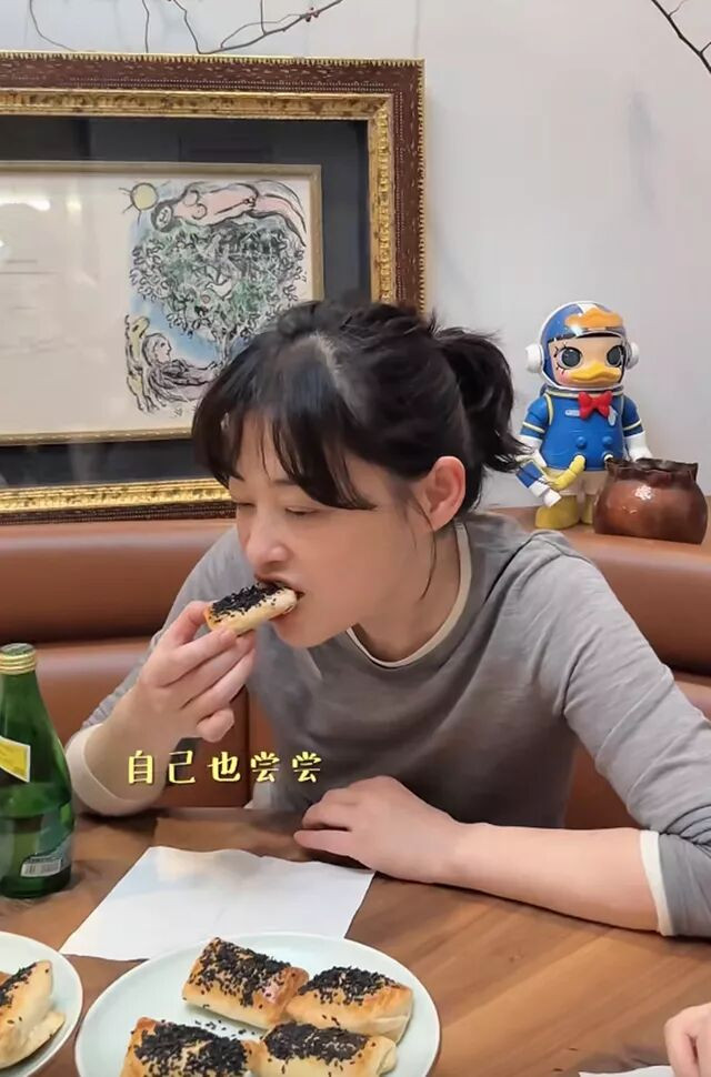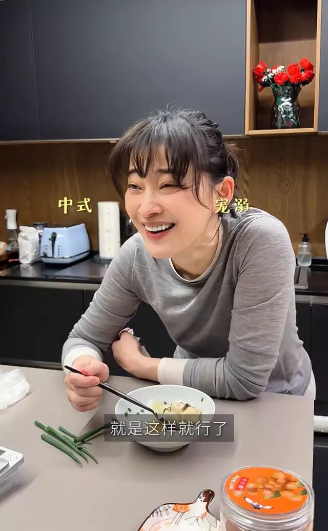 当日,梅婷身穿一件浅灰色长袖上衣,下身搭配一条白色长裤,整体穿搭简约舒适,充满居家生活气息。她留着齐刘海短发,发丝自然垂落于额前,显得随性而真实。