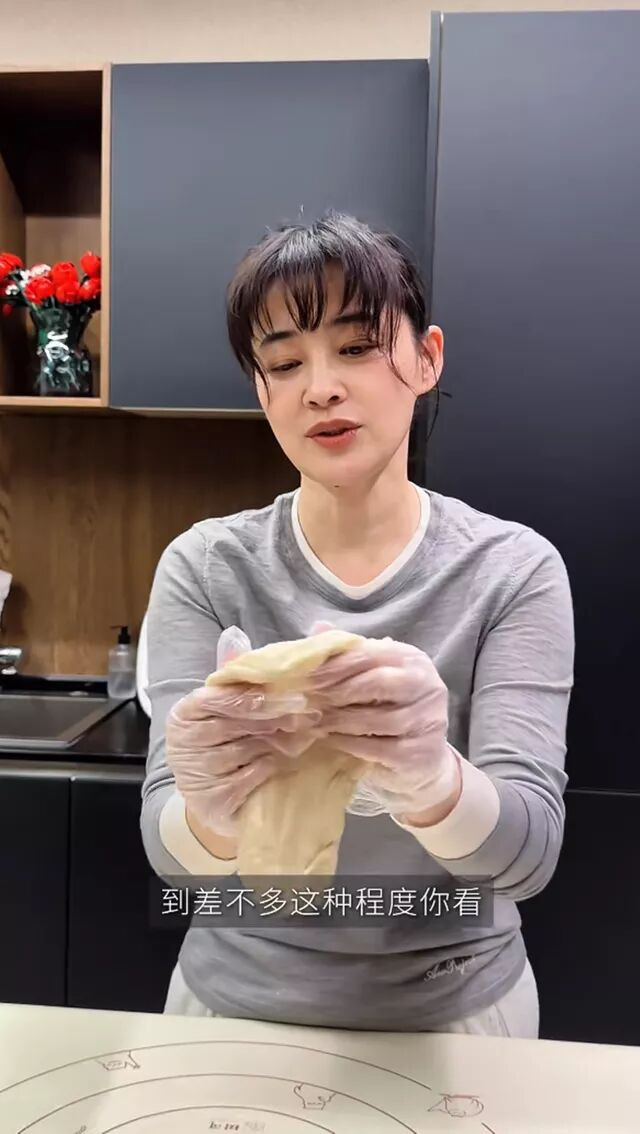 准备给团队小伙伴做芝麻烧饼的梅婷,她双手戴着透明一次性手套,正专注地揉捏一块淡黄色面团,动作熟练而温柔,展现出生活化的一面。