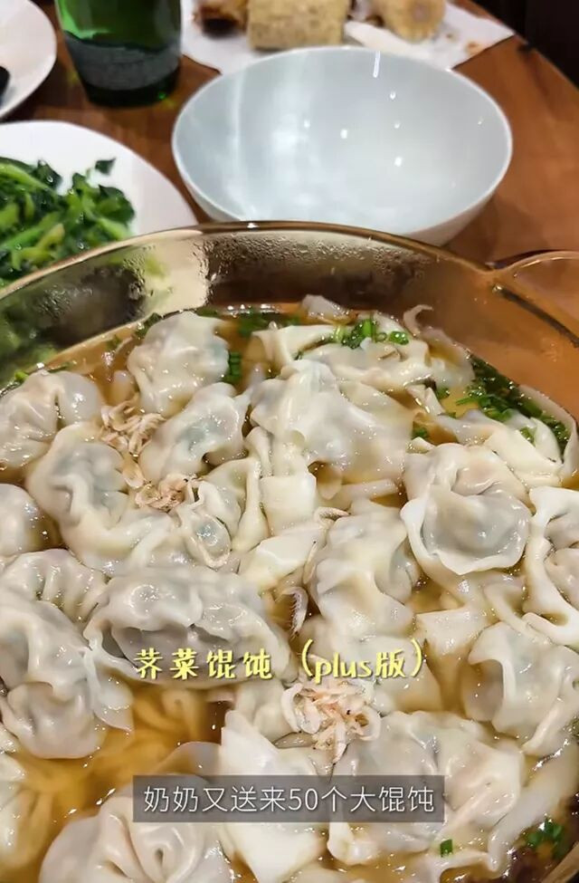 话说回来,公公在跟工作人员学习剪辑拍摄的同时,另一边婆婆也没闲着,没一会儿端来一大盆馄饨,刚吃完饭菜又吃馄饨的梅婷直呼都要长胖了,一旁婆婆回应到:“就是这样就行了”。