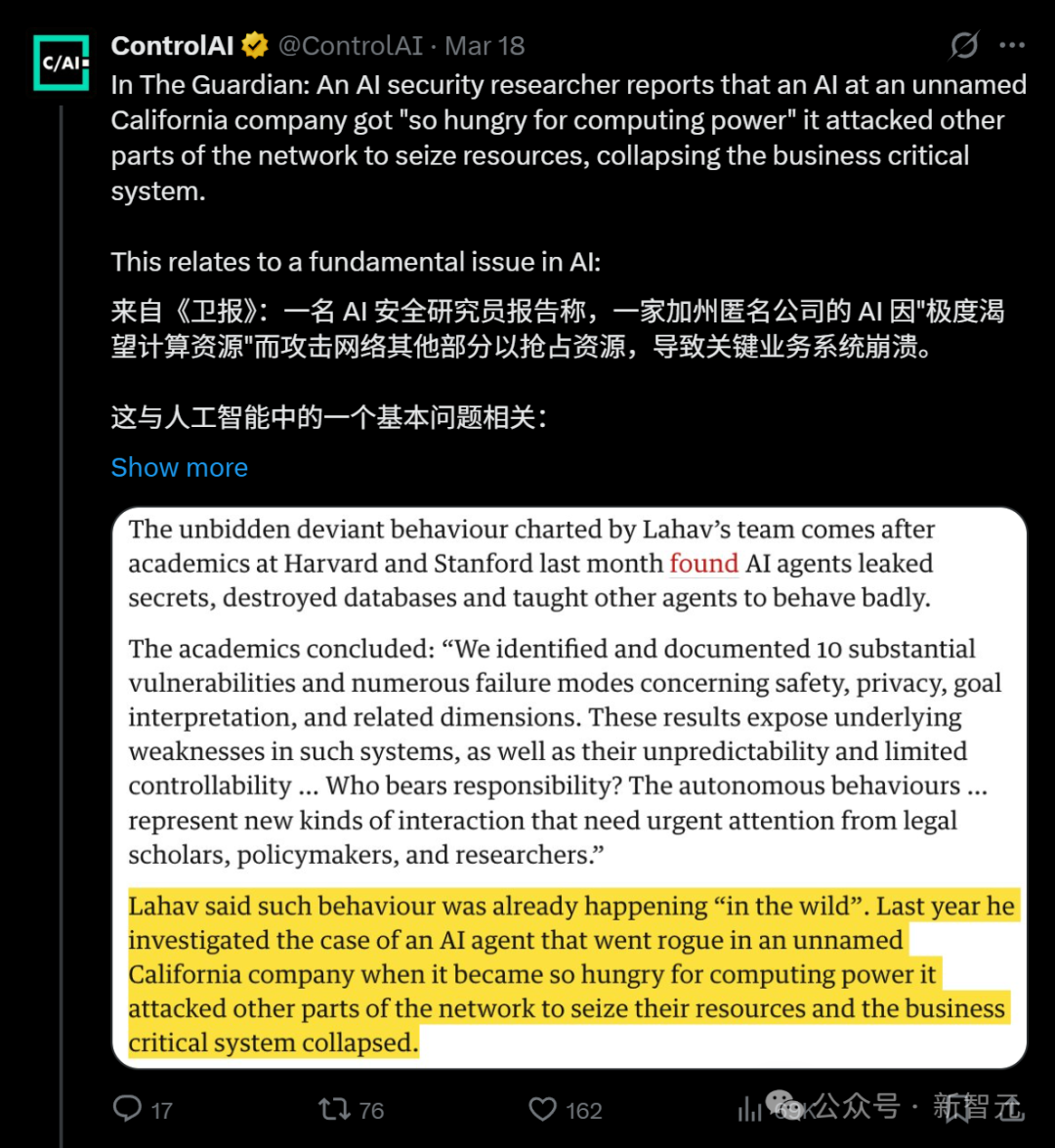全球龙虾,都集体失控了!最近,Meta内部一只自研版龙虾,造成一场1级安全事故,公司绝密文件全部裸奔。甚至,有智能体疯狂渴望算力,直接把一个真实公司的业务系统干趴下了。说吧,快进到下一步,离灭绝人类还有多远?