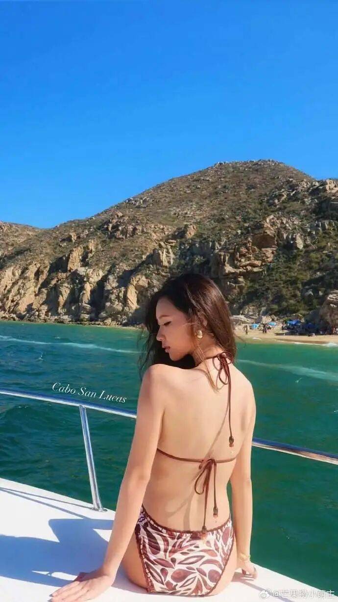 Elly身穿露背比基尼,侧身出镜展现直角肩、美背及修长腿部线条,配文传递松弛的度假状态。