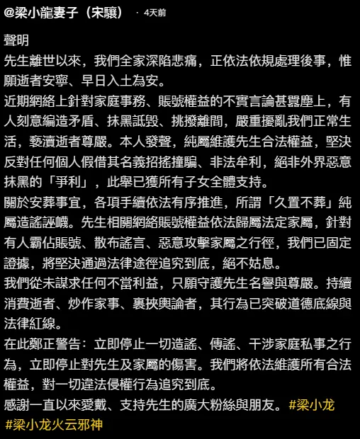 针对徒弟方的指控,自称梁小龙妻子的账号 “梁小龙妻子(宋骧)” 发布声明回应,称先生离世后全家正依法依规处理后事,惟愿逝者安宁、早日入土为安,所谓 “久置不葬” 纯属造谣诬蔑;网络上针对家庭事务、账号权益的不实言论系有人刻意编造矛盾、抹黑诋毁,严重扰乱正常生活、亵渎逝者尊严。