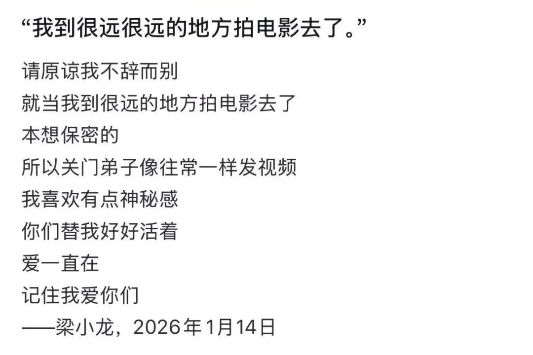 视频内容为三张梁小龙的照片,视频文案写道:请原谅我不辞而别,就当我到很远的地方拍电影去了,本想保密的,所以关门弟子像往常一样发视频,我喜欢有点神秘感,你们替我好好活着, 爱一直在,记住我爱你们。 这段文字最后的署名为梁小龙,时间为2026年1月14日。
