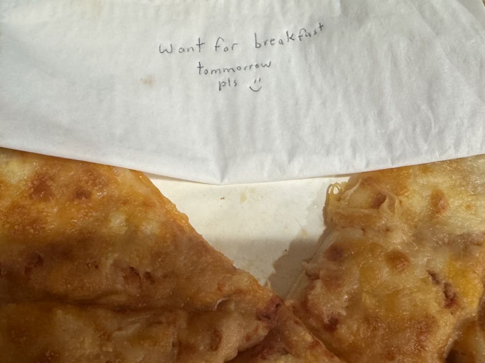 话说今天早上跑步前,看到昨晚剩下的pizza上,竟然有个小纸条,爱美丽知道我早上跑步前经常偷吃她的东西,lol。特别留了纸条说这个pizza她要当早饭吃的。论家里有个爱偷吃的老妈。。。。惭愧。。。