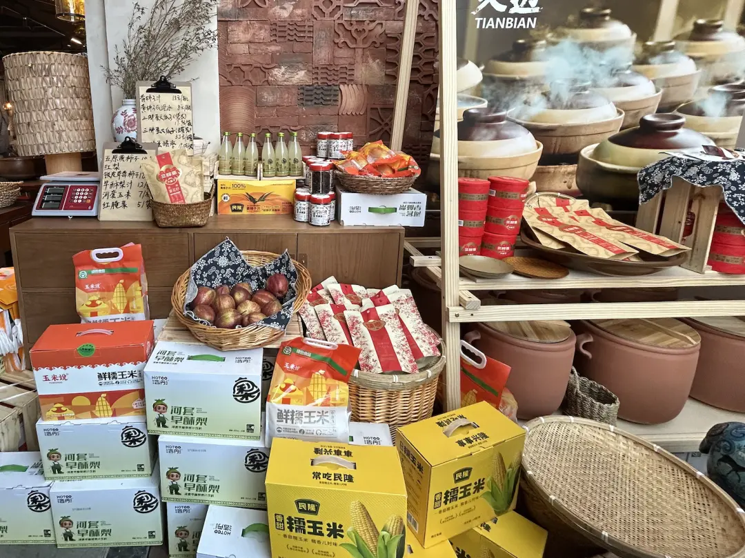 店内通往二楼的楼梯上,还摆放着巴盟面粉、河套梨汁和糯玉米等产品。上述店员介绍,这样做既是为了展示原料,也可以单独售卖。