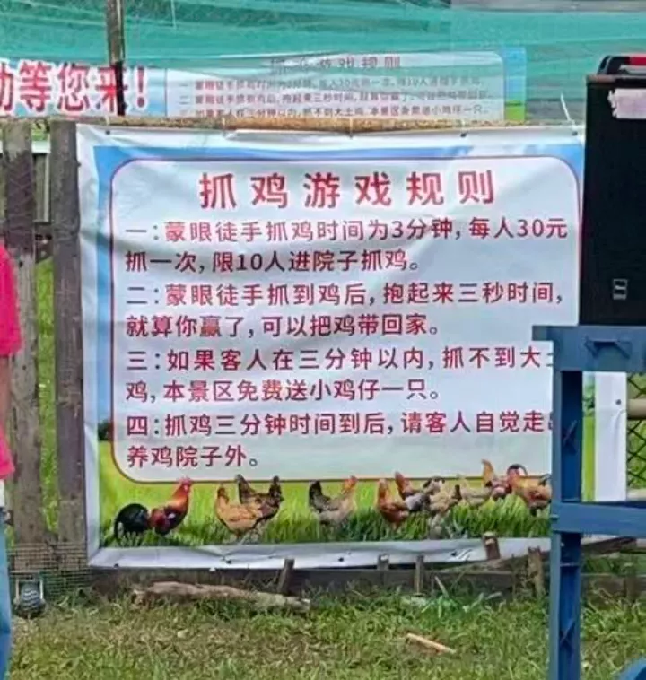 30块钱蒙眼睛抓鸡,抓到带走,抓不到赠送一只过去校门口卖一块钱一只的彩色小鸡。