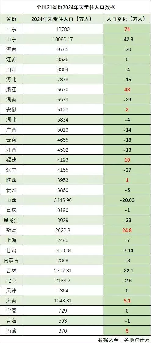 到2025年,常住人口过亿的省份仍有两个,但山东在连续减少后只有10043万人,不排除未来两年内跌出“亿级人口省份”行列。