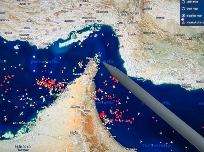 ▲荷莫兹海峡遭伊朗封锁,波斯湾海域可见多艘货船进出不得。 (图/VCG)