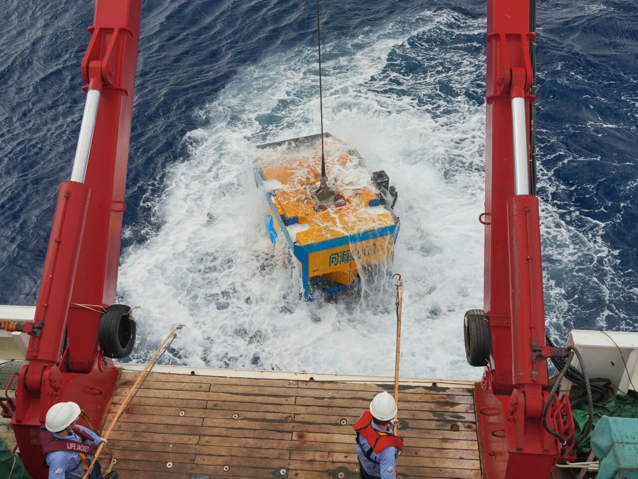 “问海6000h”完成6523米深潜科考任务后回收 崂山实验室供图