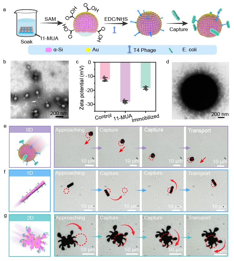 该研究提出了一种简单、通用的可编程结构的硅基微机器人制备策略,成功构建了覆盖0D至3D的多维结构光驱动微机器人体系,并实现了光驱动、磁操控与生物功能化的一体化集成。通过引入噬菌体功能化修饰,该系统进一步获得了对目标细菌的特异性识别与捕获能力,为微纳机器人在生物医学、环境监测领域的实际应用开辟了新路径。