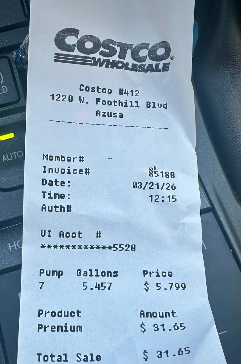 读者提供的21日在好市多加油的收据。(读者提供)