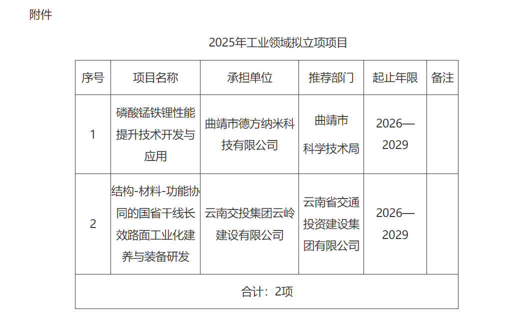 根据《云南省科技计划项目管理办法》(云科规〔2022〕5号)等规定,经省科技厅厅务会议审议通过,现将2025年工业领域2个拟立项项目进行公示,公示期为5个工作日(2026年3月18日—24日)。