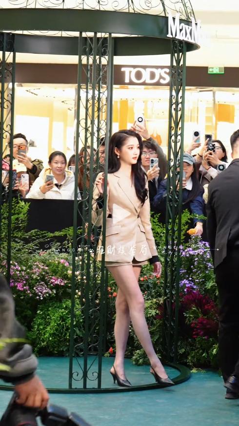 有路人随手拍的生图里,她站在人群中,光是腿就比旁边的工作人员长出一大截,先天优势真的太突出了,这也是这次造型唯一没被吐槽的地方。