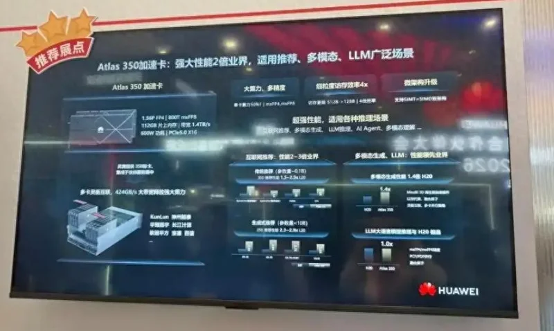 其性能方面,相比于之前的芯片,有了非常大的提升。数据显示,Atlas 350的FP4精度算力为1.56P,带宽为1.4TB/s;功耗为600W。Atlas 350的单卡算力达到了英伟达H20的2.87倍,更是国内唯一支持FP4低精度的推理产品。
