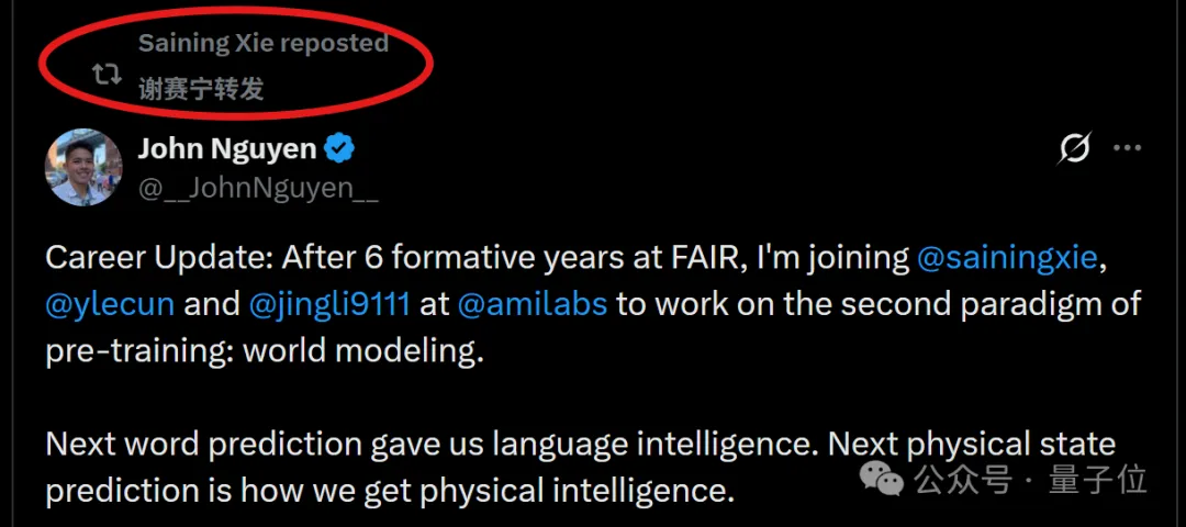 其加盟AMI(LeCun创立的公司)的消息经由谢赛宁转发确认: