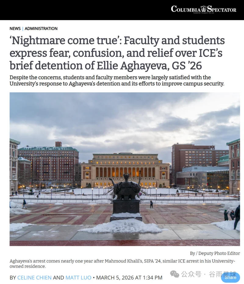 2月26日清晨,近期因为暴力执法而臭名昭著的美国移民与海关执法局(ICE)人员,竟然用「寻找失踪儿童」这种极其离谱的谎言,骗开了哥大宿舍的大门,抓走了一名即将毕业的国际学生。