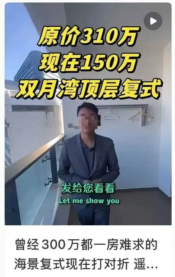 2020年入手的海景房,刚到手就开始跌了。但是因为还抱有一丝希望,认为没准儿熬一熬总会涨。结果熬了五年,同户型挂牌价从300万跌到150万,还是无人问津。中介劝:再降点儿?可是现在的买家开口就是对半砍。