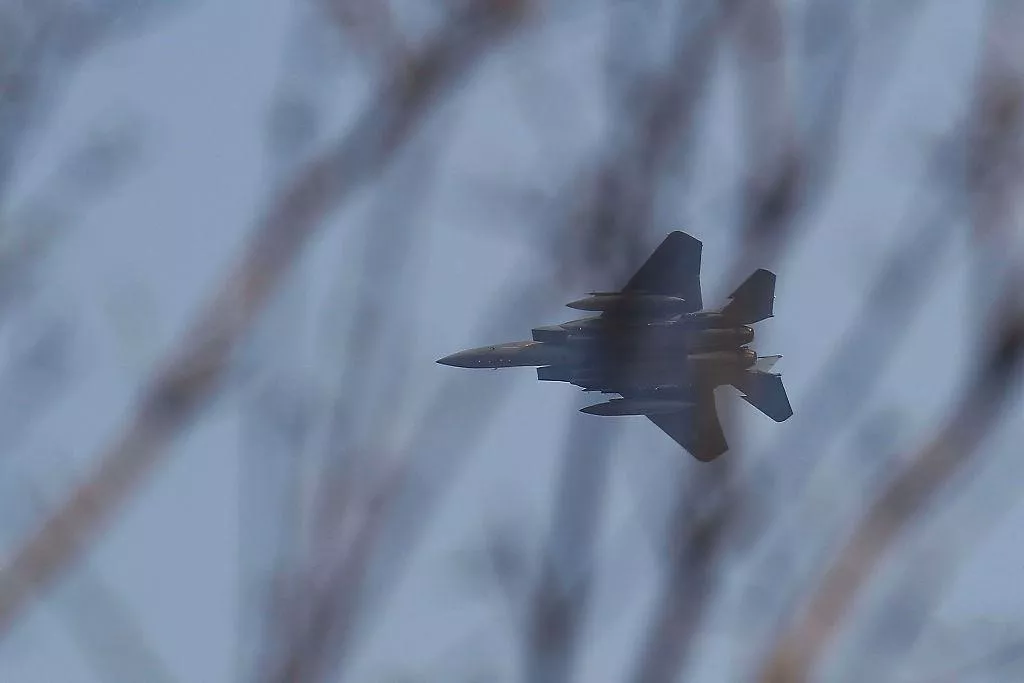 2025年3月6日,韩国大邱,图为美国空军的F-15E战机在美军基地上空进行飞行训练。(Getty)
