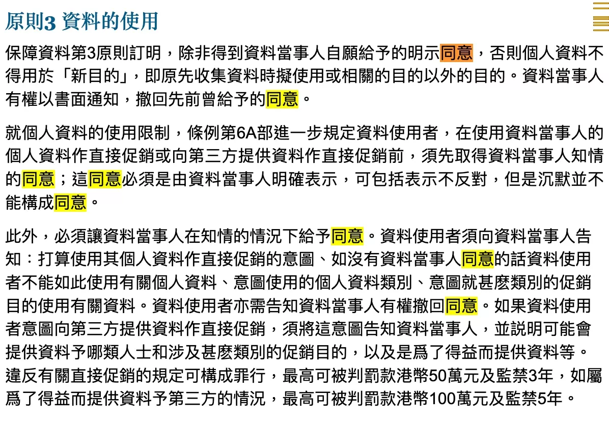 根据条例中的“保障资料第1原则”(收集目的及方式)及“第3原则”(使用),企业必须以合法及公平的方式收集资料,并且在未经当事人明确同意下,不得将资料用于新目的。然而,如同 Claude 在视频中所述,香港网民在使用跨国服务时,往往也被迫接受冗长且具霸王条款性质的“同意书”。