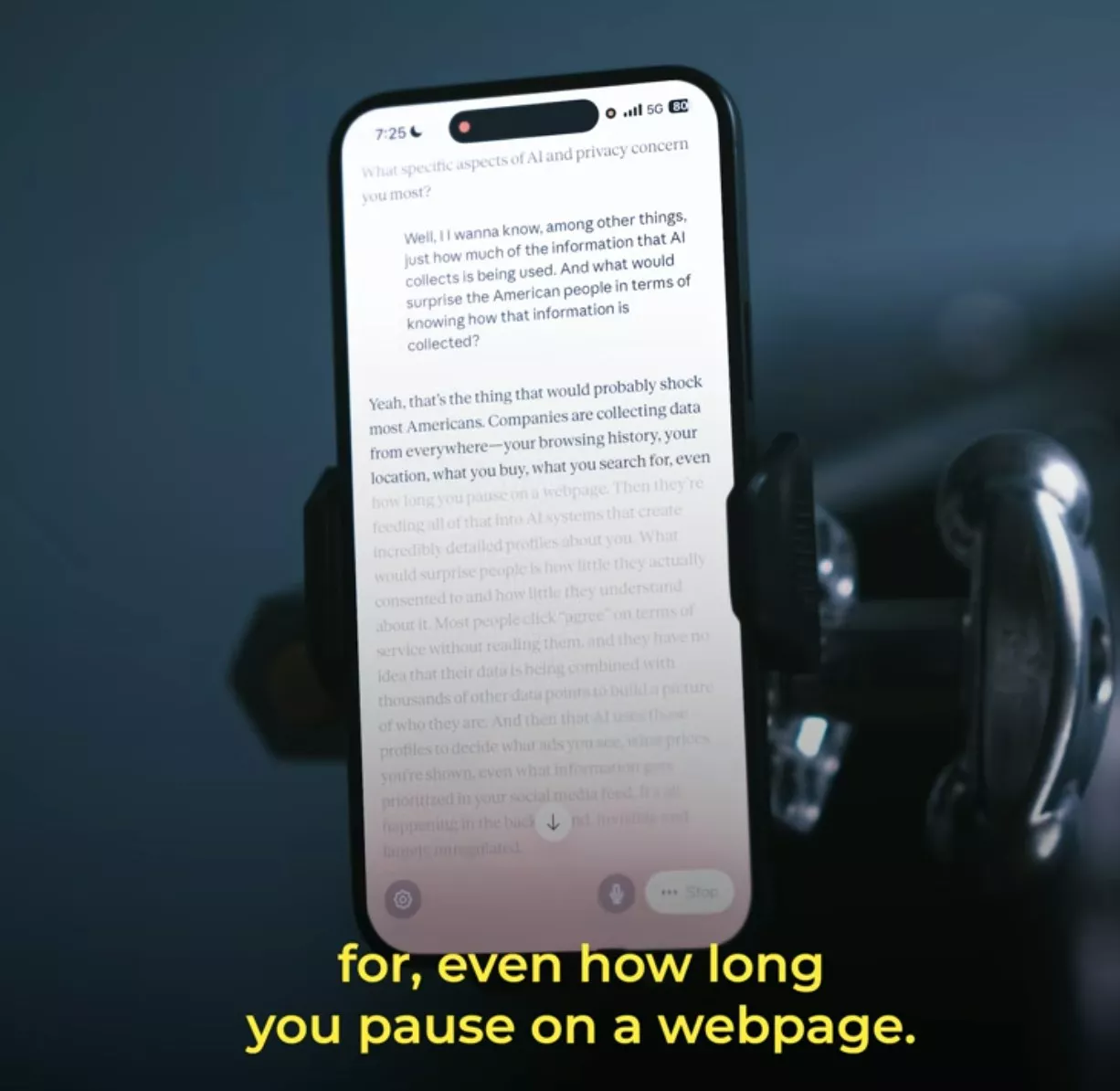 视频一开始,桑德斯一针见血地提问:“美国民众对于 AI 收集资料的程度,究竟有多少了解?”Claude 的回应令人不寒而栗。它直接说,企业正在从各个层面收集数据,除了常规的浏览纪录、位置资讯和购物清单,甚至连“用户在特定网页上停留了多少秒”都在监控之列。记者发现,Claude的回答直接导致这条视频上载不足24小时,便吸引了170万人观看。