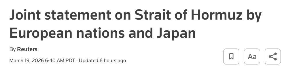 本周四,英国、法国、德国、意大利、荷兰和日本罕见联合发表声明,表示将参与适当行动,以保障霍尔木兹海峡的安全通行,并采取措施稳定全球能源市场。