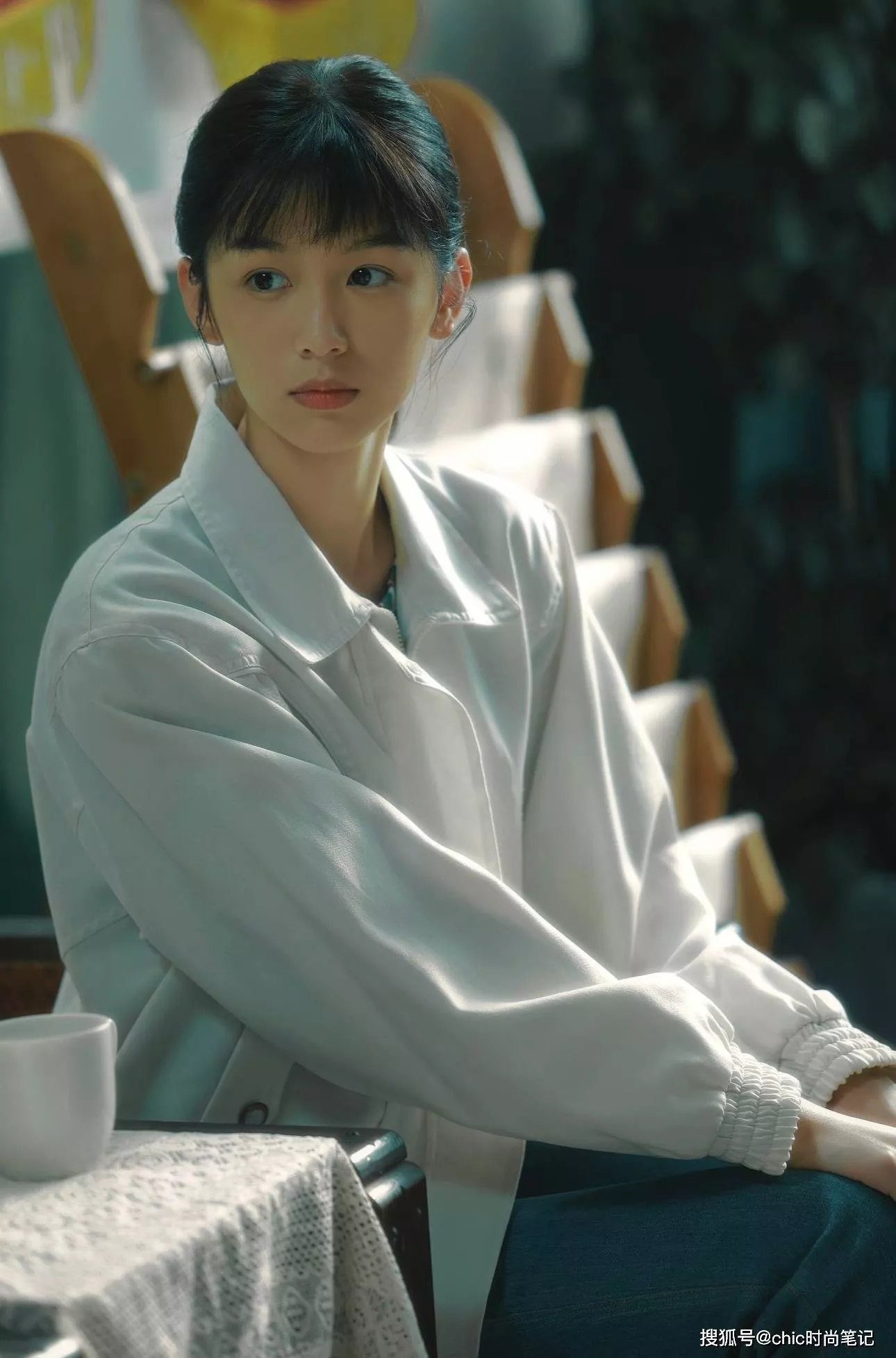 白色夹克衫简单大方,搭配基础款牛仔裤,方便又舒适。配上夏晓兰齐刘海高马尾的发型,干净、纯粹!