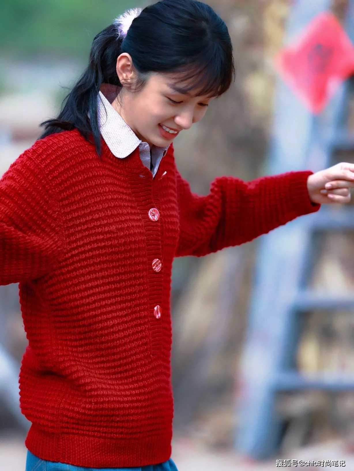 粗线毛衣开衫搭配衬衫的穿搭法一直流行到现在,条纹衬衫的清新和红色毛衣的张扬形成鲜明对比,是那个年代少女对未来的无限憧憬和向往。