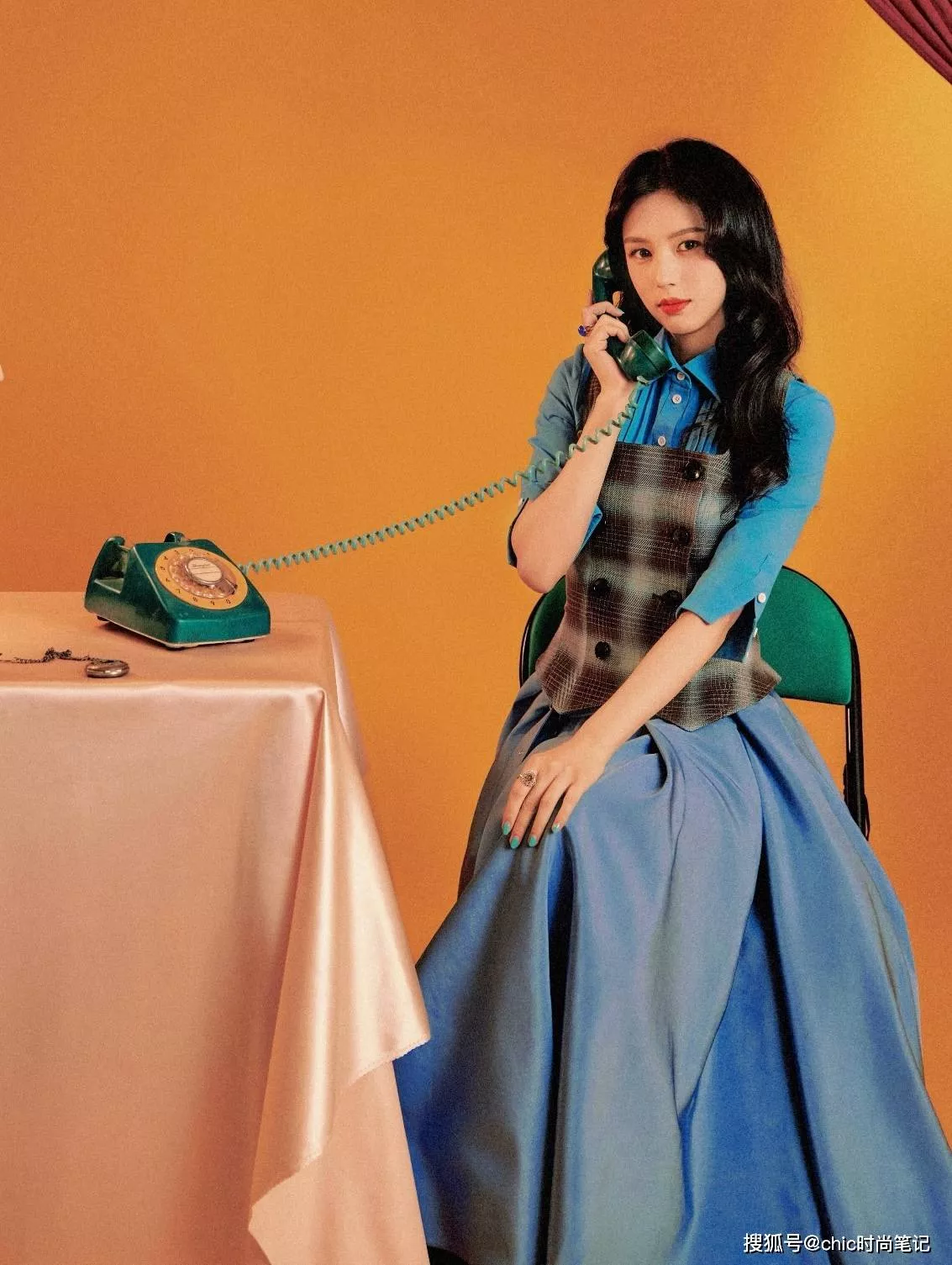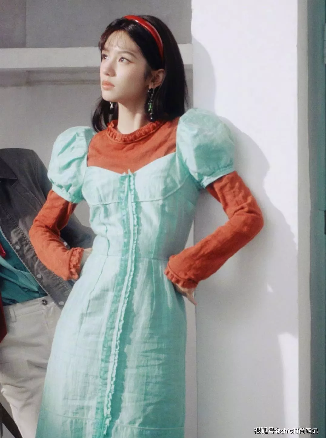 橙色+薄荷绿拼接色十分亮眼,泡泡袖和木耳边的设计符合那个年代的时尚审美,纯棉面料贴肤又舒适,搭配红色发箍和钻石耳环,整个人充满向上的朝气。