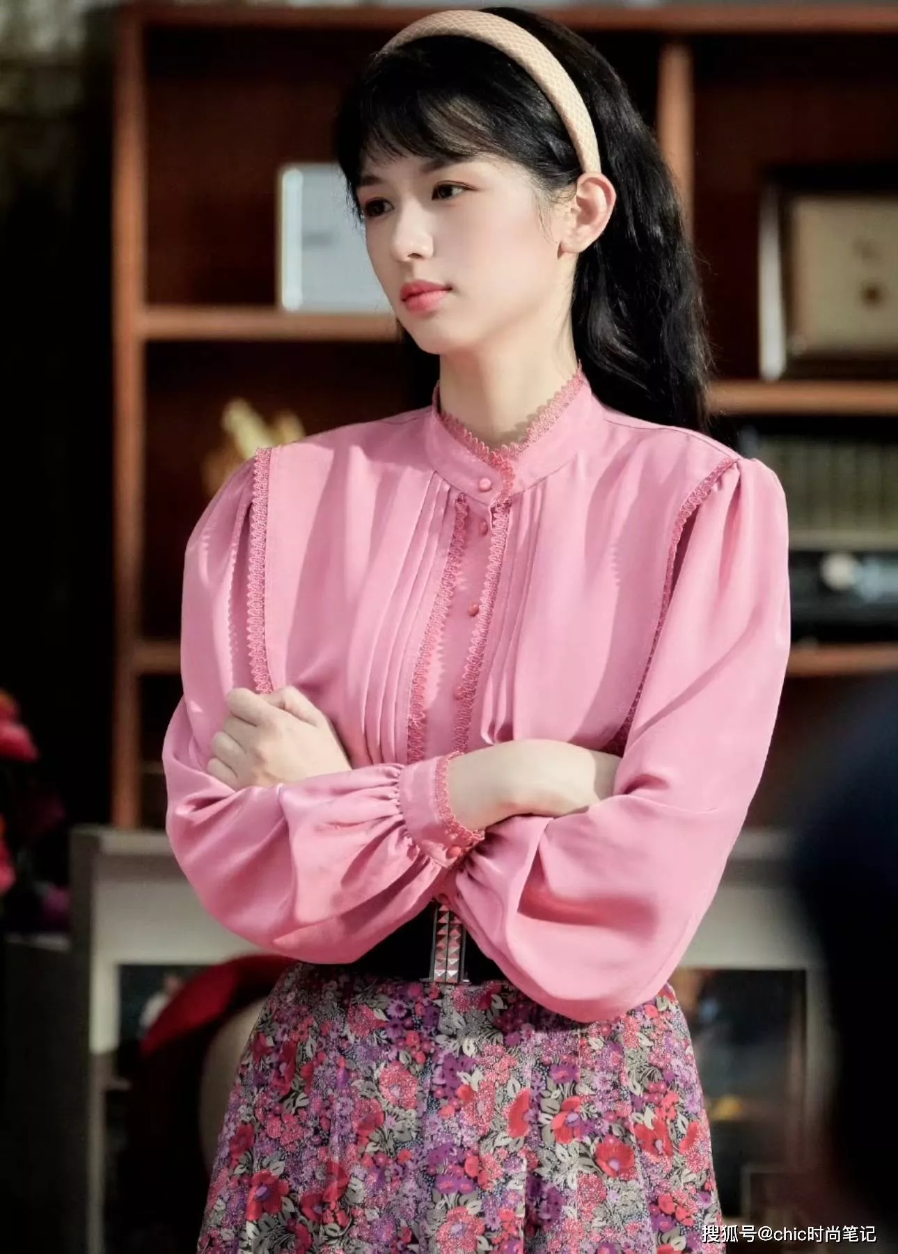 八零年代很火的“的确良”衬衫,立领+蕾丝+泡泡袖是复古感的经典设计,下身搭配碎花半身裙,好有春日氛围感,腰间搭配宽版腰带,轻松展现腰臀比。