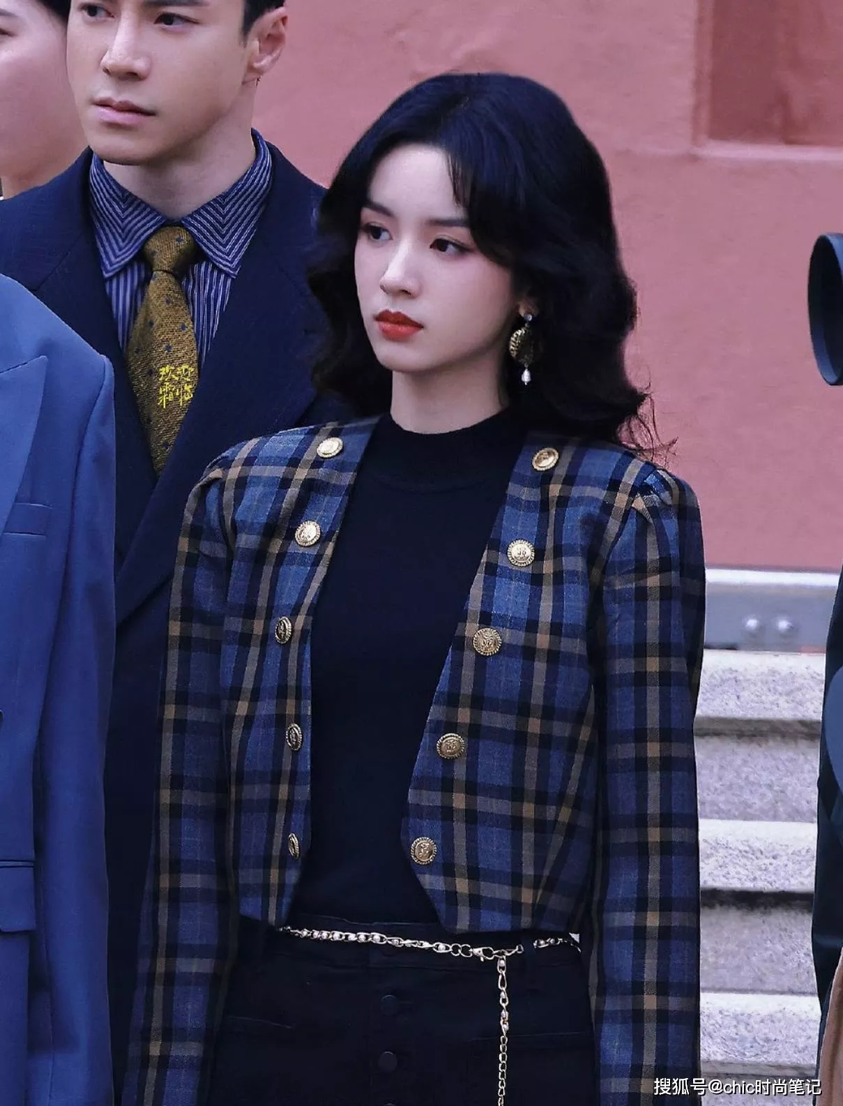 那个年代特别流行格子元素,这款蓝色格子外套用金色纽扣点缀,增加重工设计和时髦气息,内搭黑色毛衣和黑色西装裤,笔挺且干练,金属腰链和金珠大耳环是亮点,略带夸张感更能展现经济上行的美感。