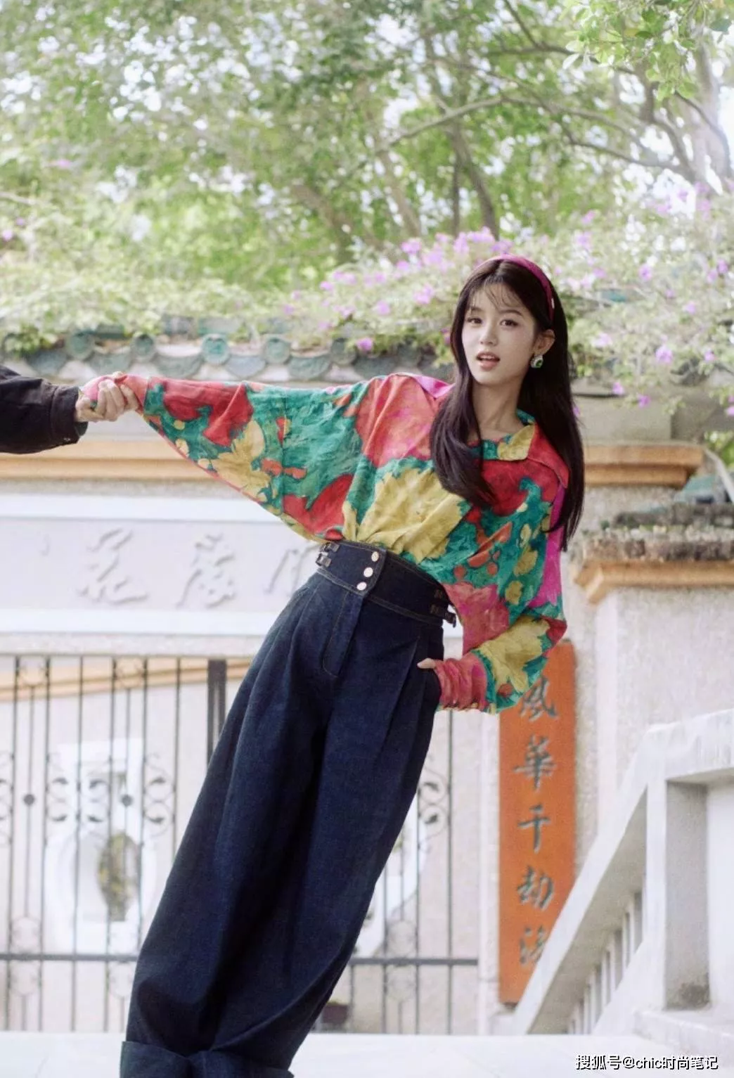 彩色印花衬衫是做了蝙蝠袖的设计,是曾经非常流行的一种风格,搭配高腰款阔腿裤,有一种经济上行的松弛美。