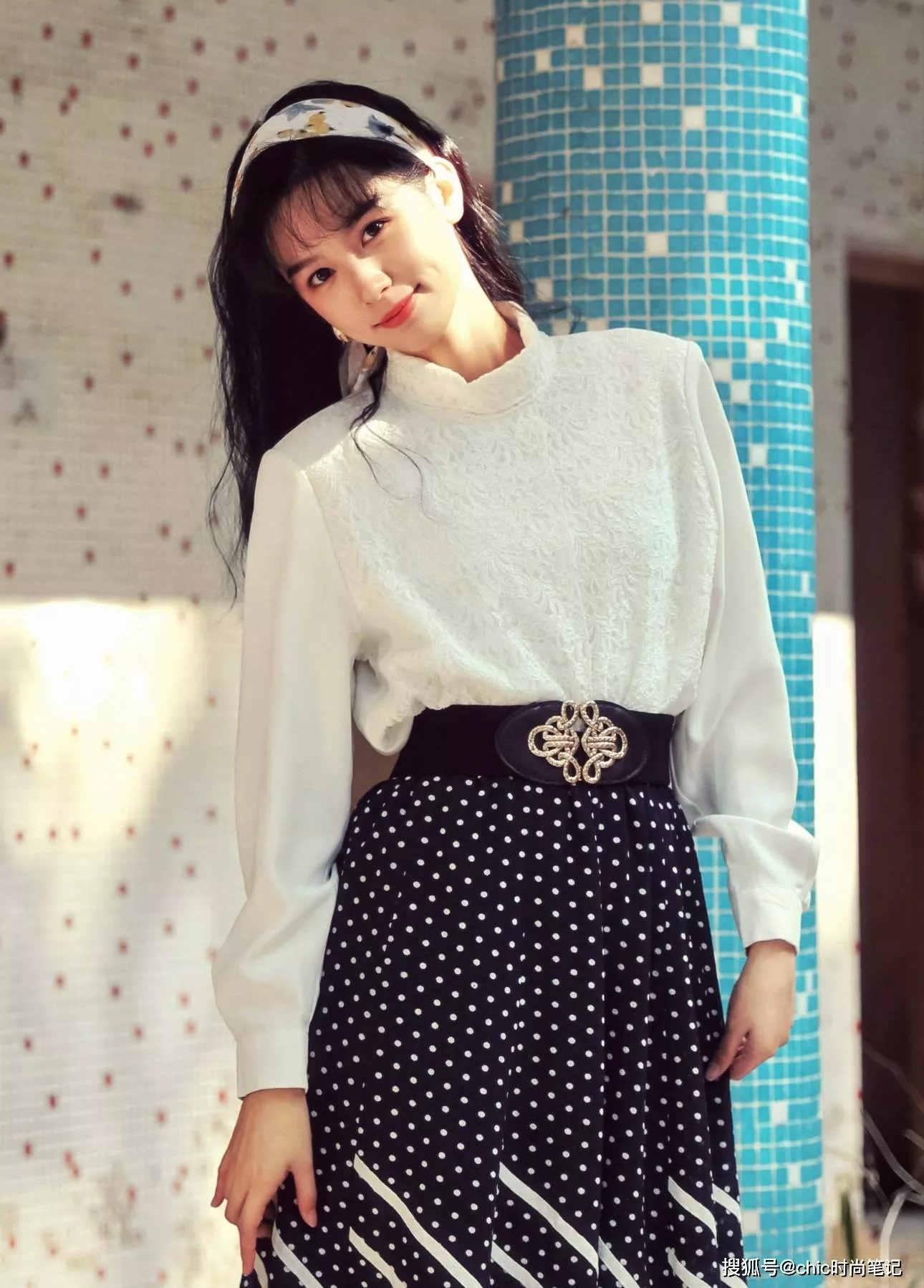 纯白色衬衫上布满蕾丝点缀,垫肩的设计很有摩登感,搭配宽版腰带和波点长裙,印花宽版发箍的点缀更符合那个年代的审美,阳光、明媚。