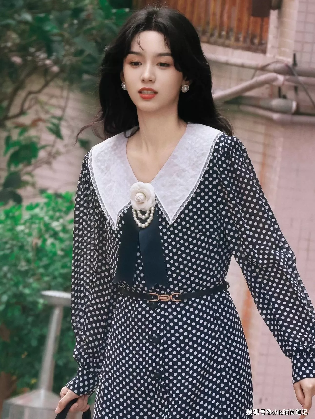 雪纺波点连衣裙自带飘逸感,白色柔纱大翻领设计,点缀上花朵装饰,让裙子更又层次和细节,金属细腰带的点缀有效“分割”身材比例,珍珠耳钉是点睛之笔。