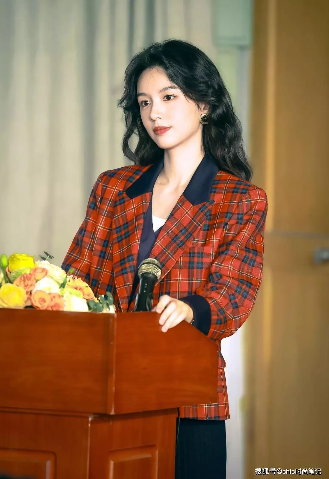 创业后的夏晓兰多了几分成熟与稳重感,一身红色格子西装外套干练且从容,搭配一头流行卷发和黑珍珠耳钉,把女性成长后的那一份担当和自信完美呈现出来。