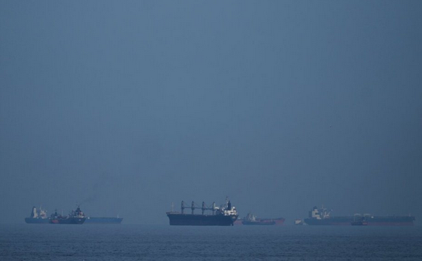 图为11日荷莫兹海峡的几艘油轮和货轮。 美联社