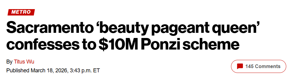 加州首府沙加缅度(Sacramento)一名自称“选美皇后”的女子,近日承认通过庞氏骗局骗取投资者超过1000万美元,用于奢华消费、赌博及度假等开销。