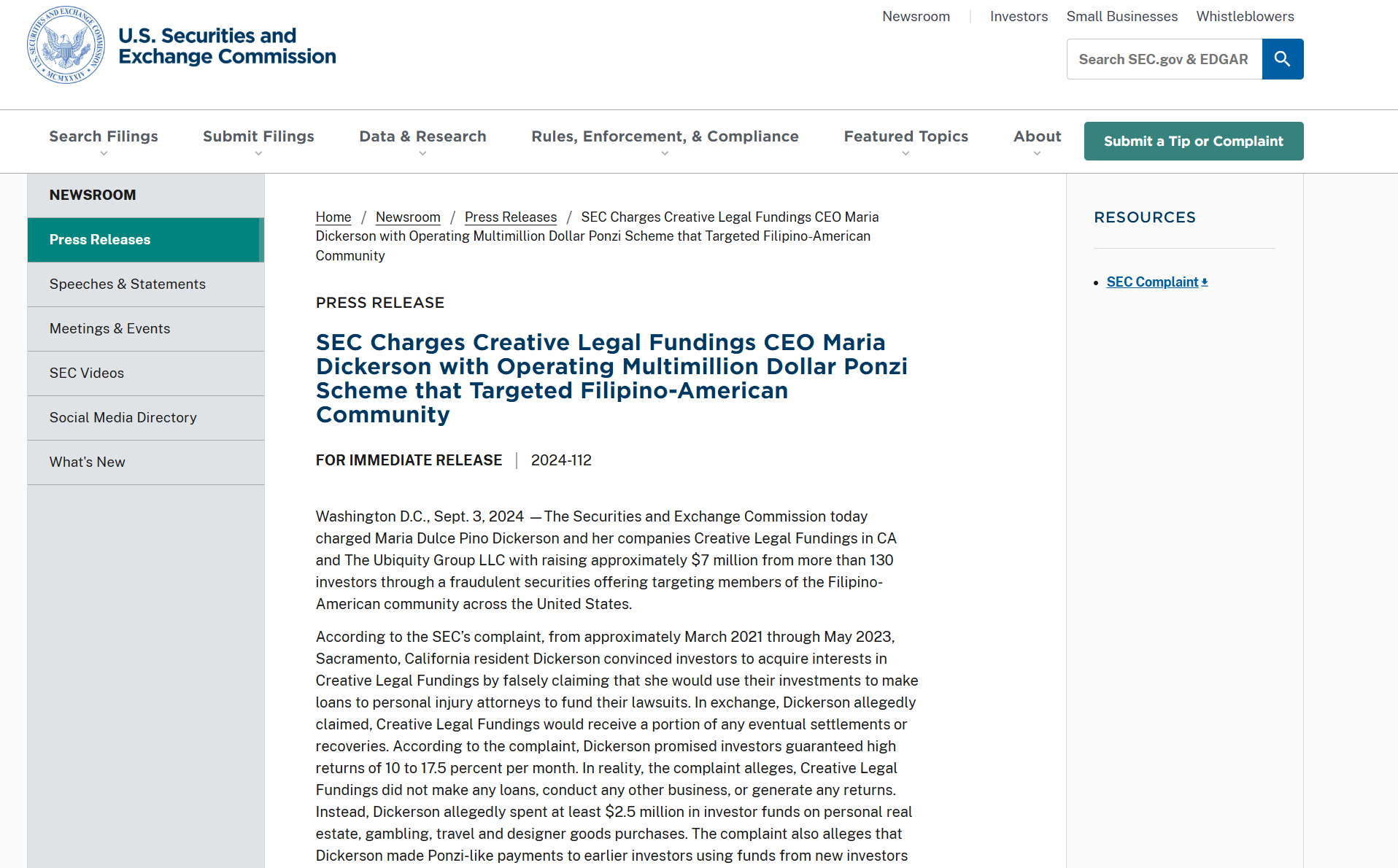 美国证监会旧金山地区办公室负责人Monique C. Winkler表示:“所谓的Creative Legal Fundings既不‘创新’,也不‘合法’,这完全是针对普通投资者的欺诈行为。”