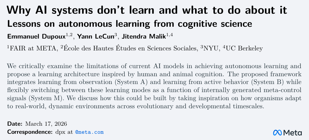 三位全球顶级人工智能专家杨立昆Yann LeCun、Emmanuel Dupoux、Jitendra Malik共同发布了一份极具颠覆性的研究蓝图。