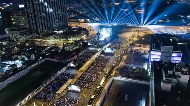 首尔为这一时刻倾尽全力,史无前例地将市中心打造成一座巨型Kpop舞台。演出场地内共有22,000个免费座位,其余观众则在沿路延伸数个街区的十余块大萤幕前观看直播。当局原预估到场人数可达25万,最终实际人数或低于这一数字,但数以万计毫无疑问。