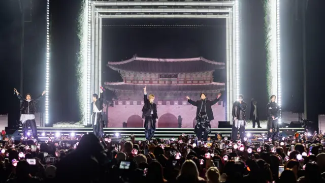 图像来源,BIGHIT MUSIC AND NETFLIX,回归直播舞台位于首尔历史悠久的光化门前。