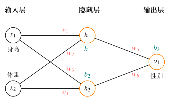 假设我们要构建一个如图 6 的简单神经网络,其任务是根据一个人的身高和体重来预测他的性别。这是一个典型的监督学习示例,身高和体重作为输入特征,性别作为输出标签。