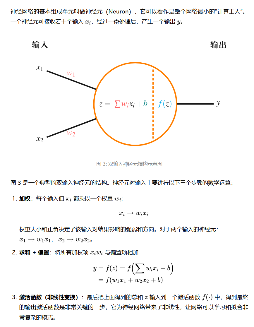 尽管神经网络的核心计算单元“神经元”结构相对简单,但大量神经元通过特定方式连接成的网络,却能展现出令人惊叹的复杂信息处理能力。本文将深入剖析神经网络的基本组成单元——神经元,阐述其数学工作原理,并展示如何将神经元组织成多层网络结构,并最终通过“训练”这一过程,使网络能够从数据中学习,完成特定的预测或分类任务[2,3]。