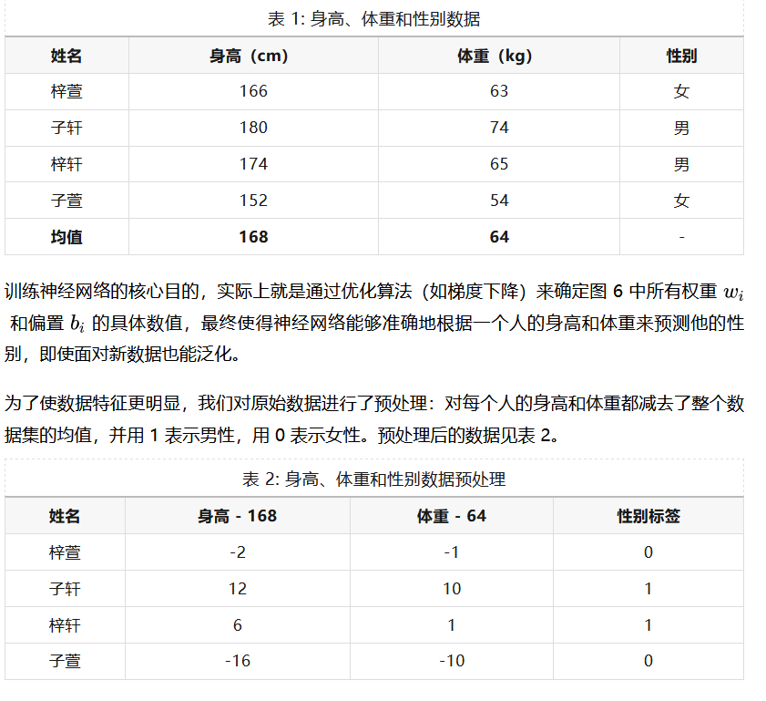 已经收集了一些测量数据,如表 1 所示。每个样本对应一个人的身高、体重及其真实性别。我们将使用这些数据来训练神经网络,让它学习如何从输入特征中推断出性别。