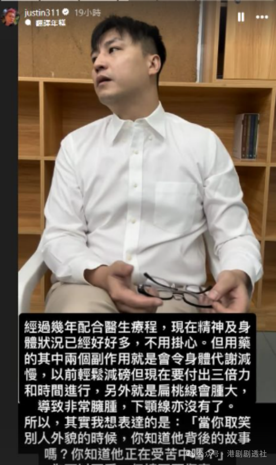 虽然他经过配合医生的治疗,焦虑症和人格解离症已痊愈,但他却因服用相关药物,导致他的身体代谢出现问题,不仅代谢变慢,扁桃腺肿大,连面部也出现浮肿。